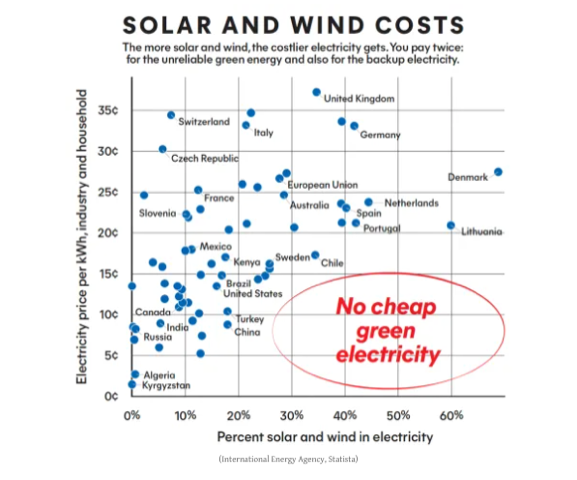 Instead, nations have found that as they ramp up their share of such renewables, electricity prices soar. As his chart shows, there is no cheap green electricity.